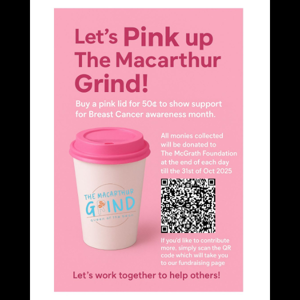 Let’s Pink Up The Macarthur Grind! ? Throughout Breast Cancer Awareness Month, you can show your support by purchasing a pink lid for just 50c, with all proceeds donated to The McGrath Foundation until October 31st, 2025. If you’d like to contribute more, simply scan the QR code to visit our fundraising page. Together, let’s make a difference and help support those affected by breast cancer! ?